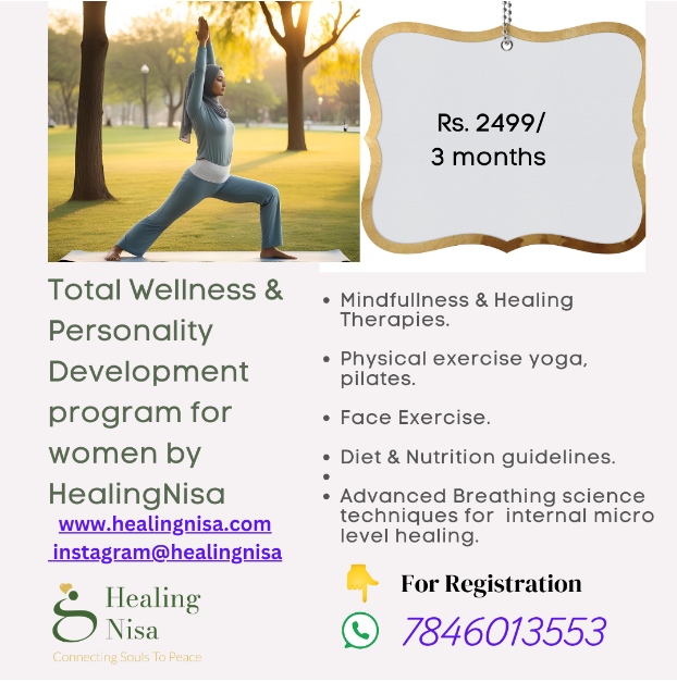 The total wellness program is specially tailored and designed as per the requirements of today's challenges faced by women. Total wellness program comprises physical exercises, Diet counseling ( Ayurvedic & Modern both), healing therapies, Face yoga, advanced breathing science that works upon the Nervous system, goal settings, positive affirmations and dhikr.